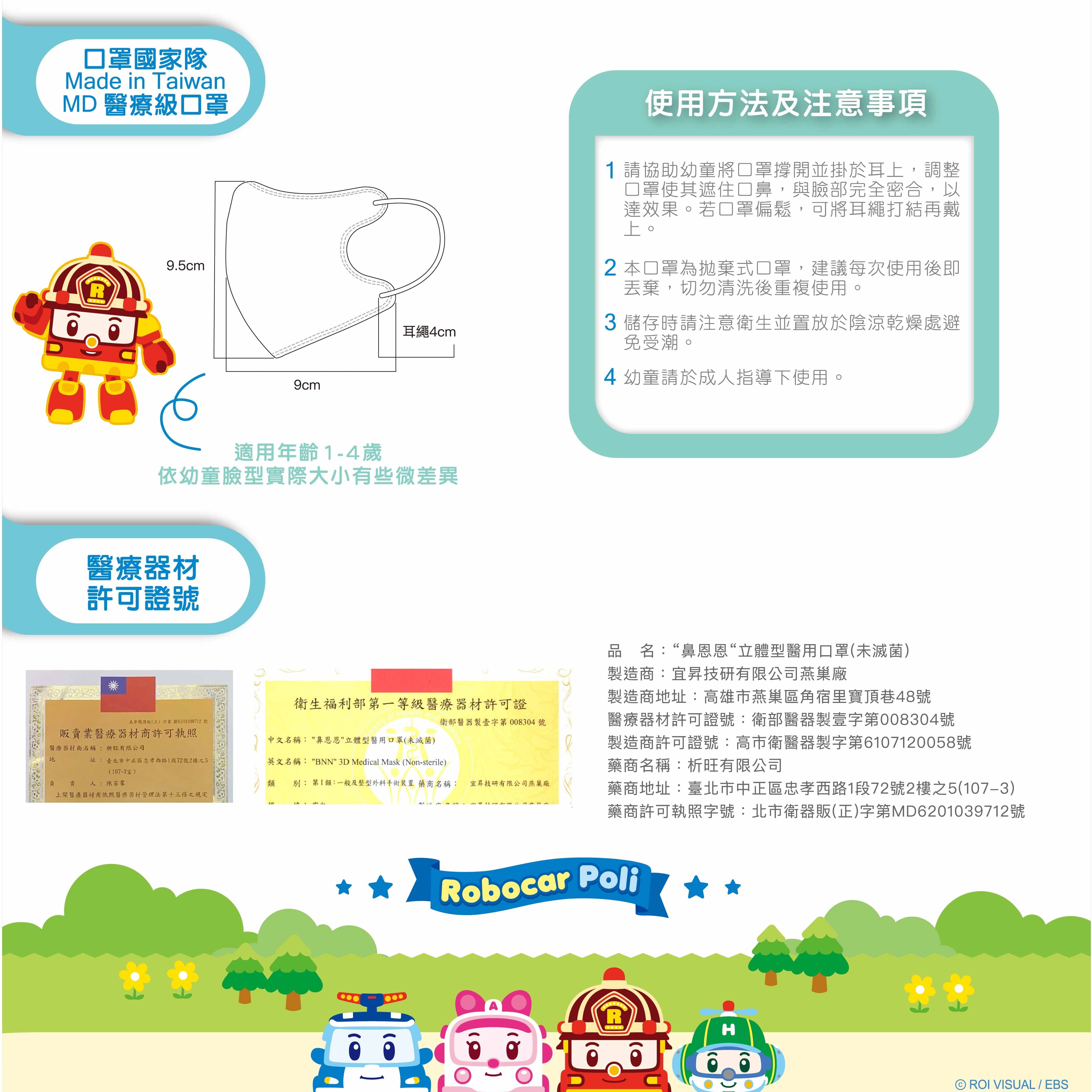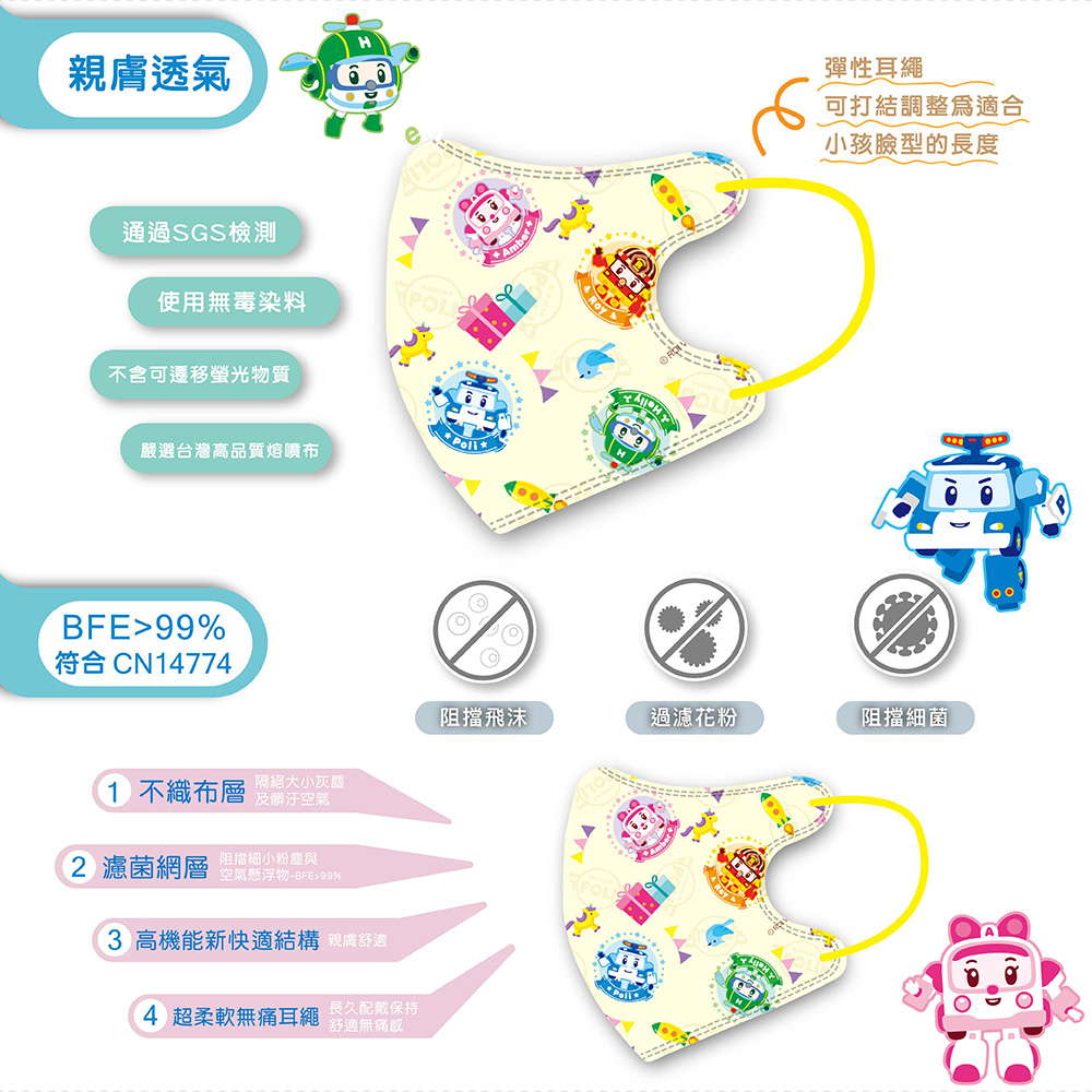 台灣「波力救援小英雄」官方授權 有效防止飛沫及過濾微小粒狀物質 符合CNS14774 般醫用口罩標準規定 通過SGS檢驗測試,使用無毒染料及不含螢光物質 【台灣製】嚴選台灣口罩國家隊生產 尺寸:平放約高度9.5*9cm;繩約4*0.5cm 建議年齡:1 - 4歲幼童 (依幼童臉型而有些微差異)
