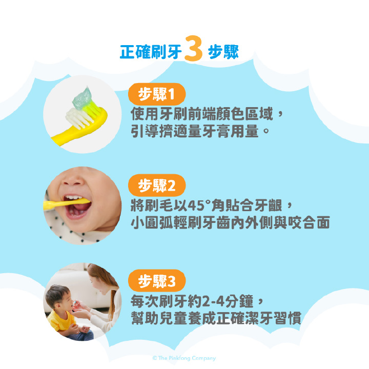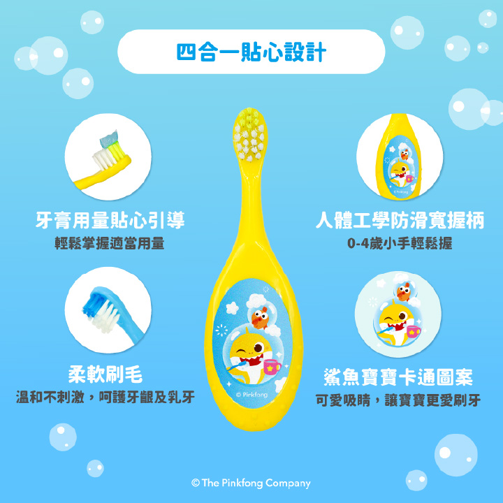 一卡兩支,雙色替換 超柔軟刷毛,保護牙齦與乳牙 牙膏指示設計,輕鬆掌握安全量 人體工學防滑寬刷柄,寶寶更好握