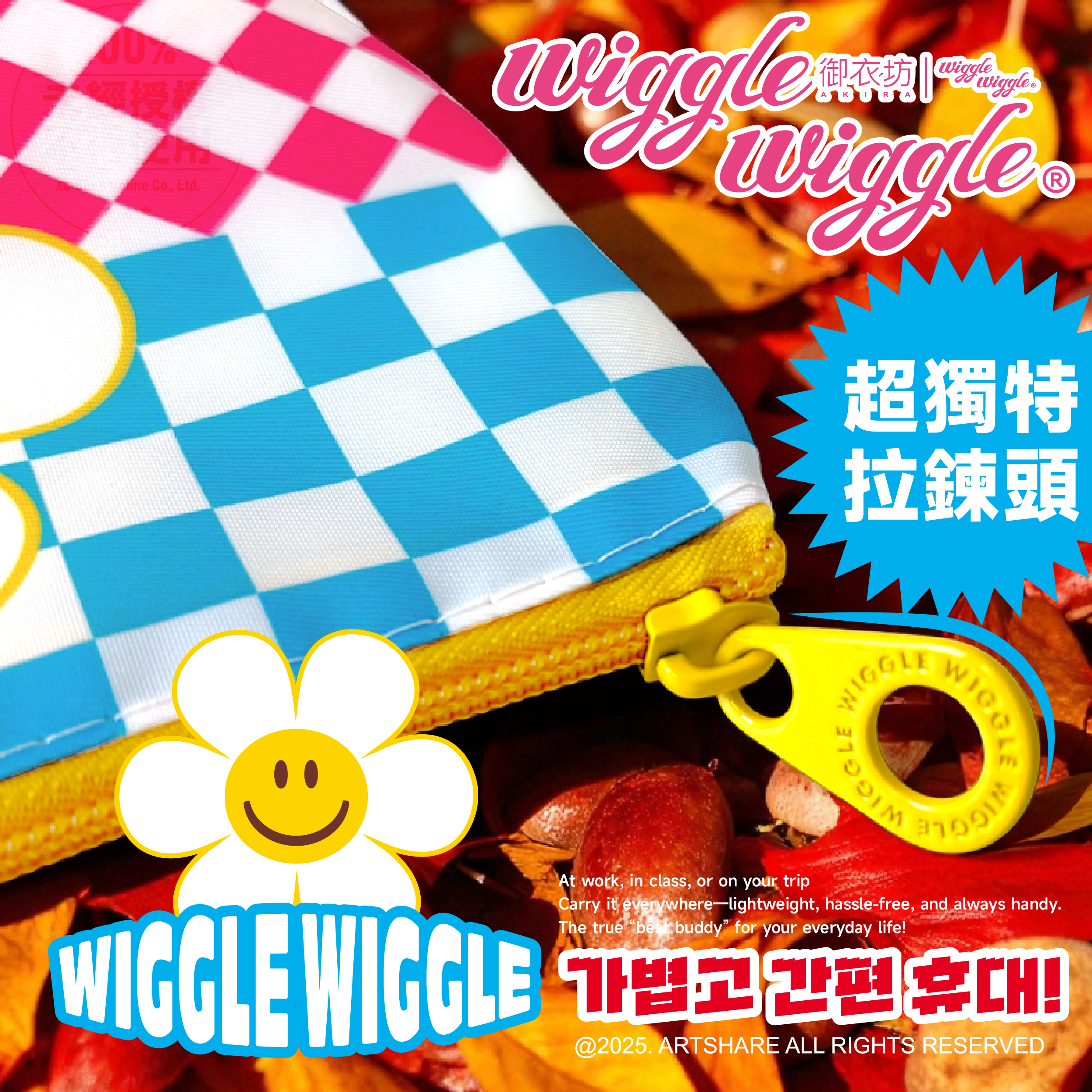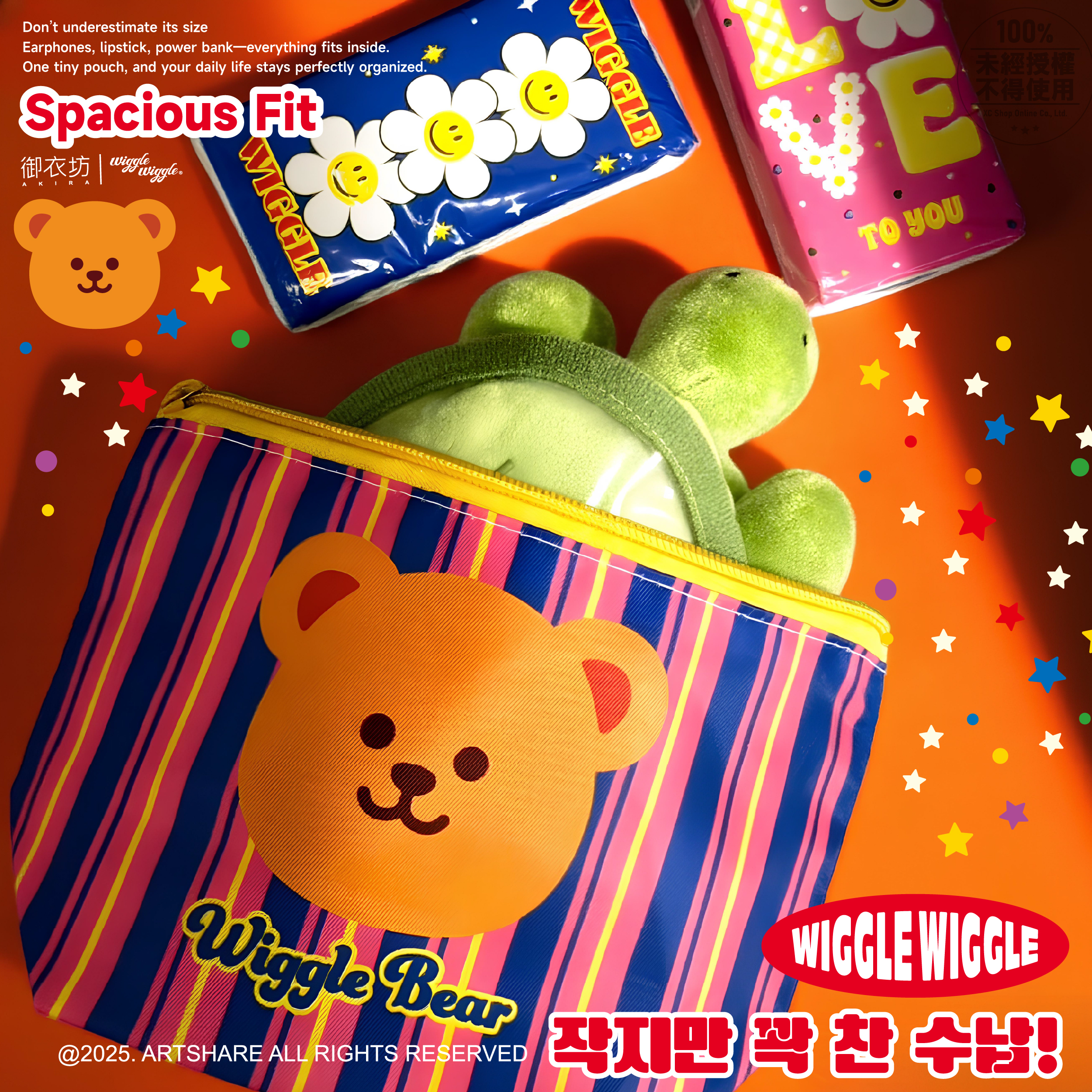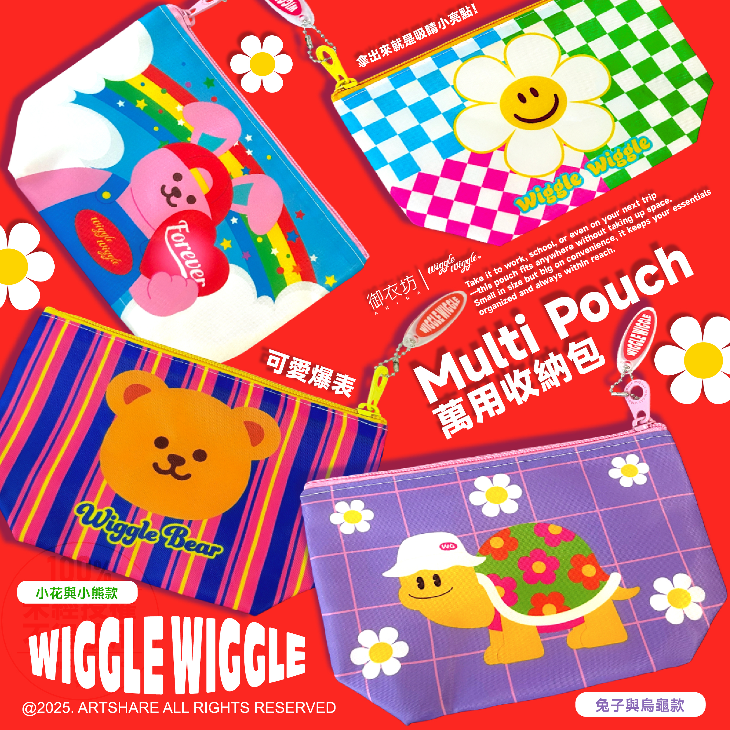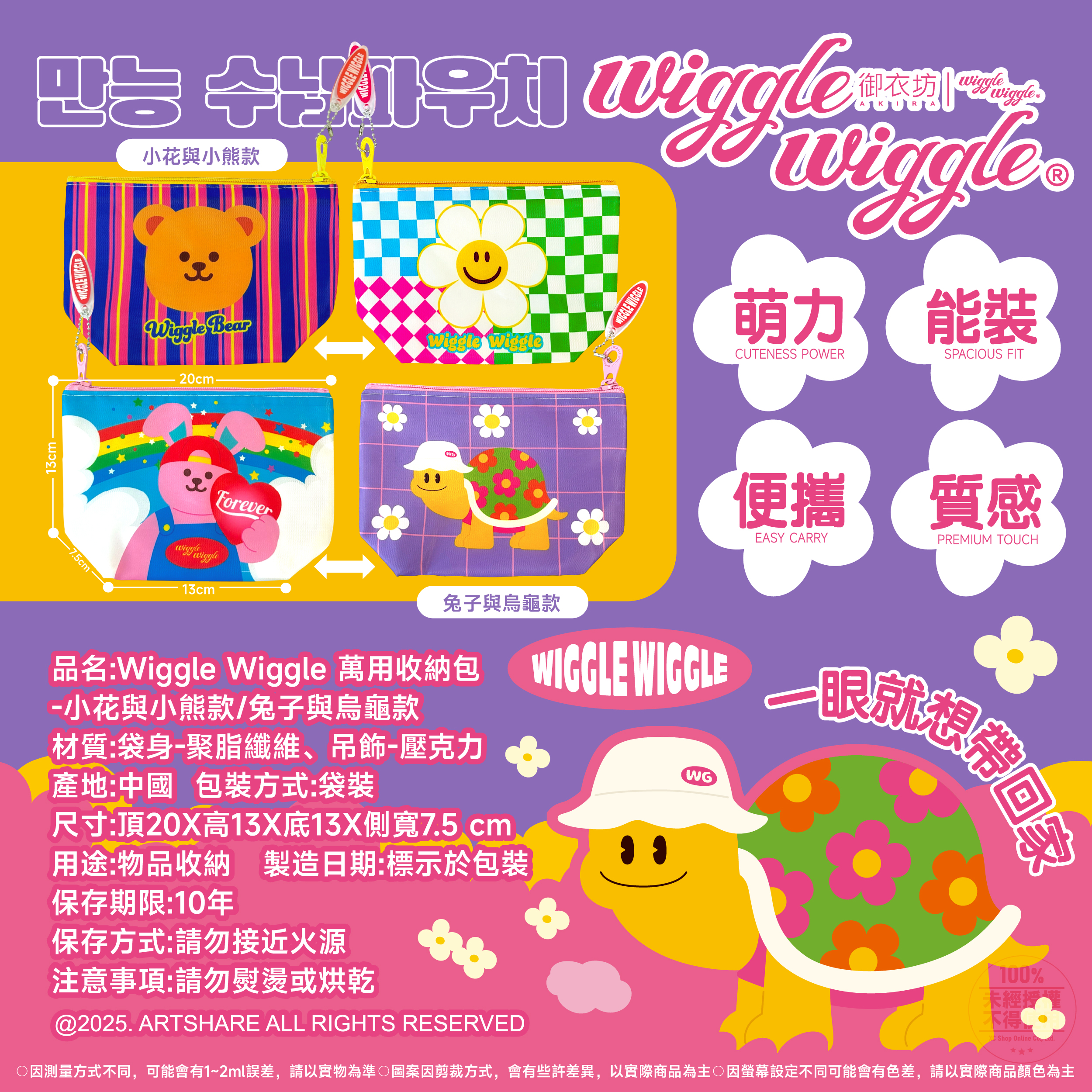 韓國人氣 Wiggle Wiggle 文創 ♥︎♥︎♥︎ 與台灣品牌正版授權系列!台灣限定 Wiggle Wiggle 萬用收納包 高質感材質,採用耐磨布料 多款花色任選,送禮自用皆適合 易清潔好整理,表面防潑水處理, 小髒污可快速擦拭,維持亮麗又好保養。 尺寸:20*13*7.5cm