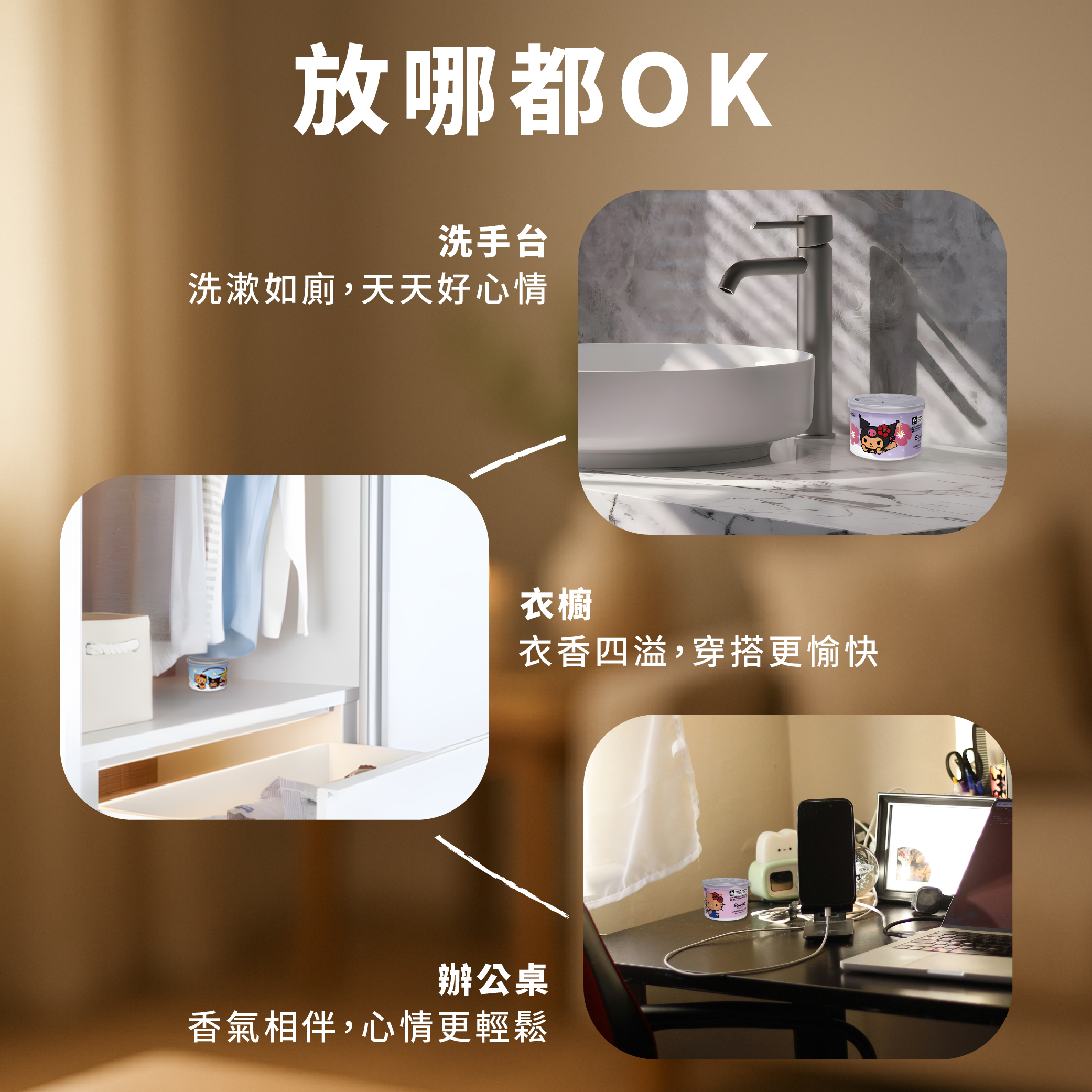 台灣 SANRIO 正版授權系列 室內香膏,持香時間長,不用頻繁更換 旋轉調整香味濃度,想濃想淡自己決定 SANRIO 正版授權,擺著就是療癒度100% 適合房間、浴室、玄關、車內,全家都能用 多香味任選,可搭配角色收藏,一次帶走多款不重複