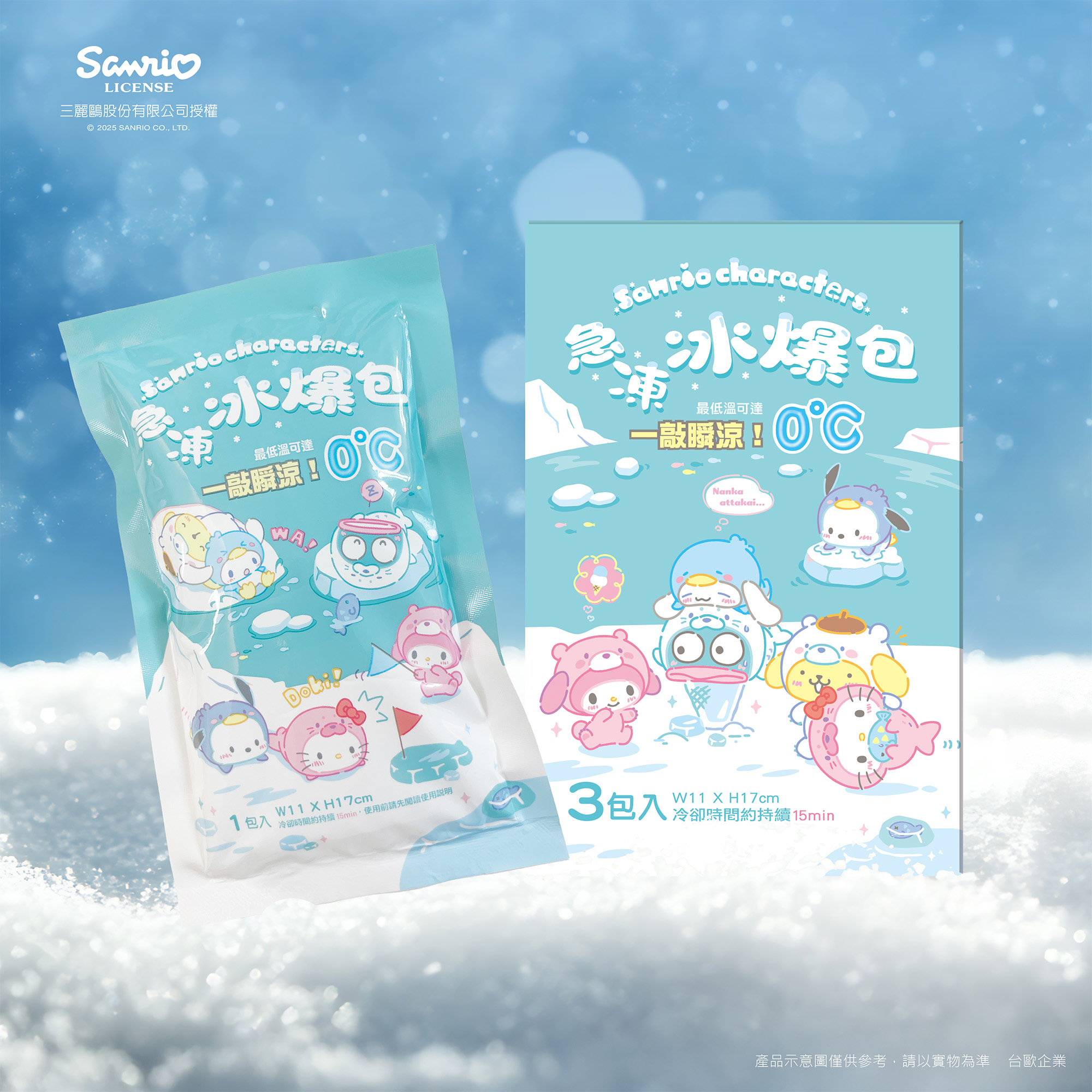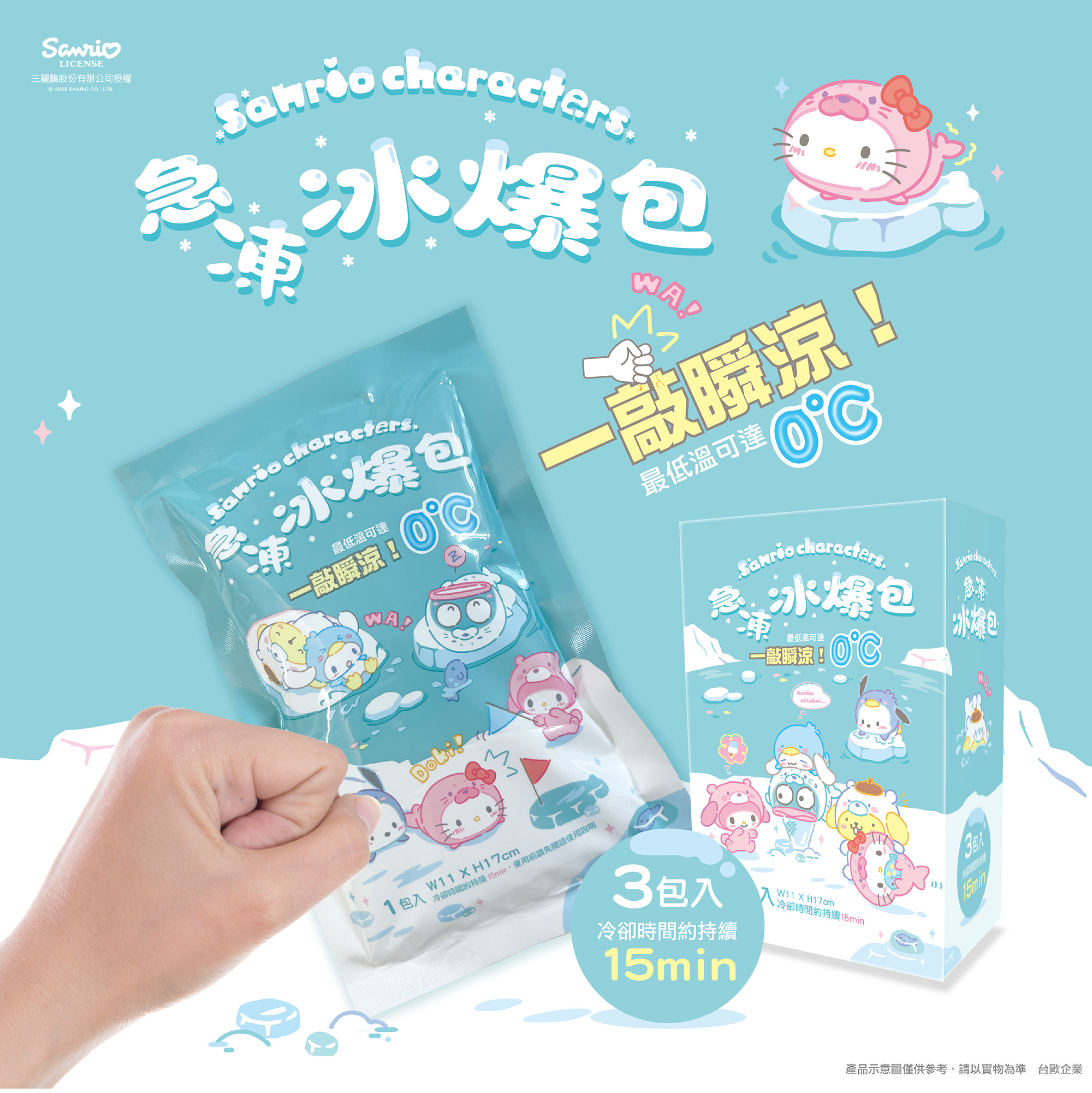 📣 台灣生活用品品牌 聯名系列 Sanrio 正版授權 — 急凍冰爆包 一敲瞬涼,即刻體驗涼爽 瞬間製冷,最低溫可達0℃ 外出保冷,重複使用不浪費 商品規格:130g*3包/盒 材質/成分:碳醯二胺、純水