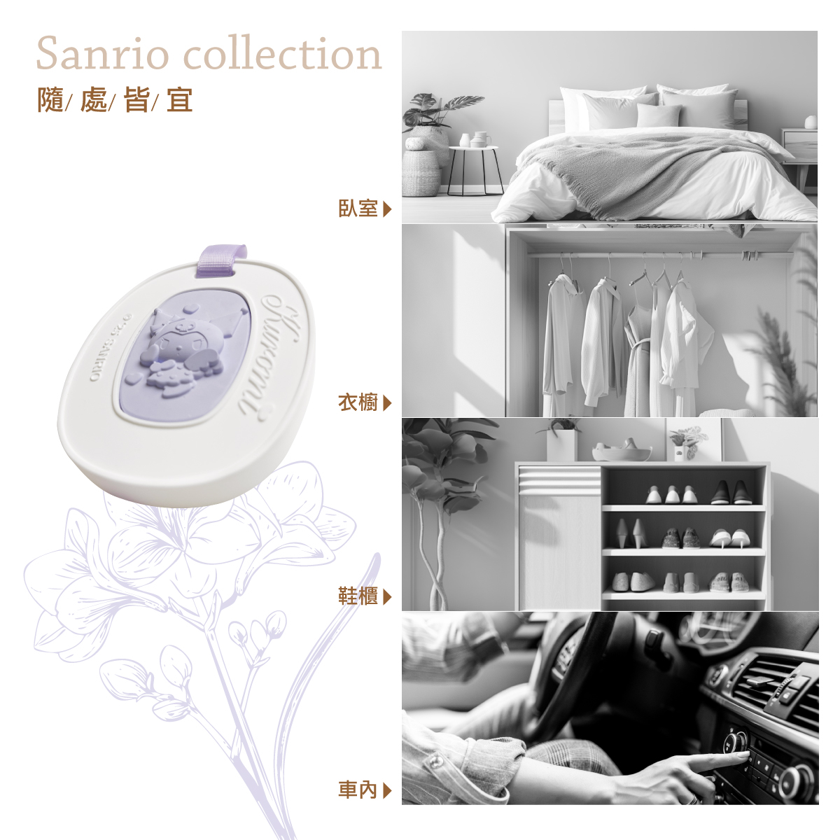 隨處皆宜|臥室、衣櫥、鞋櫃、車內 香氛長存|香味減弱時,可重新滴精油維持香氣 芬芳任選|玫瑰、茉莉、小蒼蘭、蘭風鈴