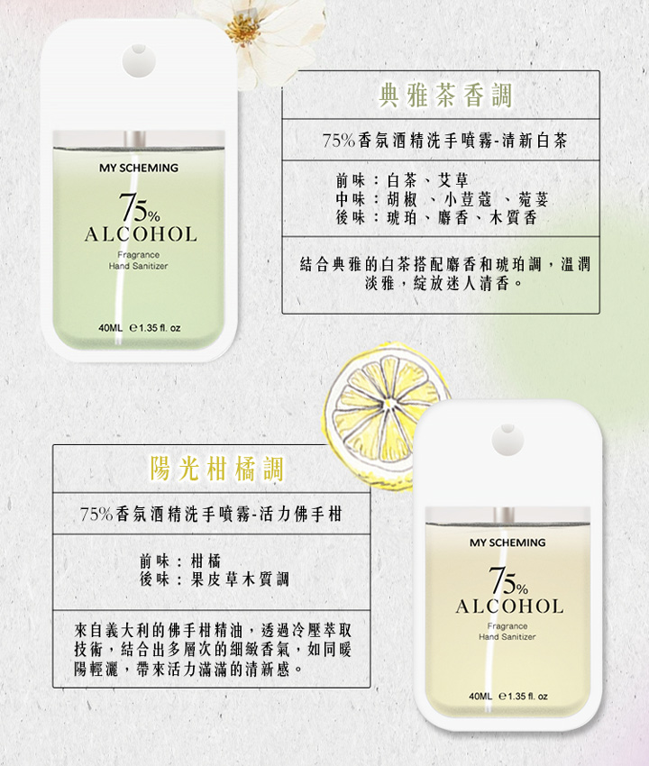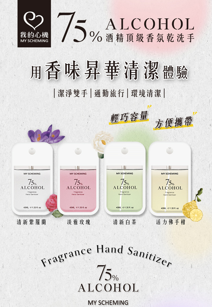 台灣「我的心機」護膚品牌新品 75%抗菌酒精,洗手噴霧隨身攜帶, 結合典雅的白茶搭配麝香和琥珀調, 清潔手部同時還散發出的清淡氣息提升整體氛圍, 放鬆享受所營造出的細膩溫暖感。 前調:白茶、艾草、佛手柑、苦橙 中調:胡椒 、小荳蔻 、菀荽 後調:琥珀、麝香、玫瑰、茉莉、木質香