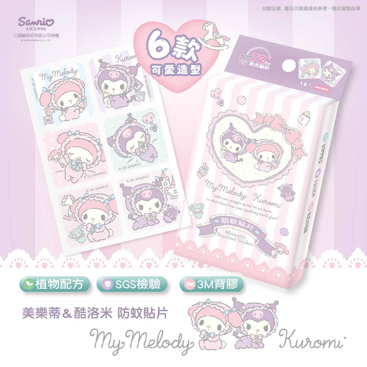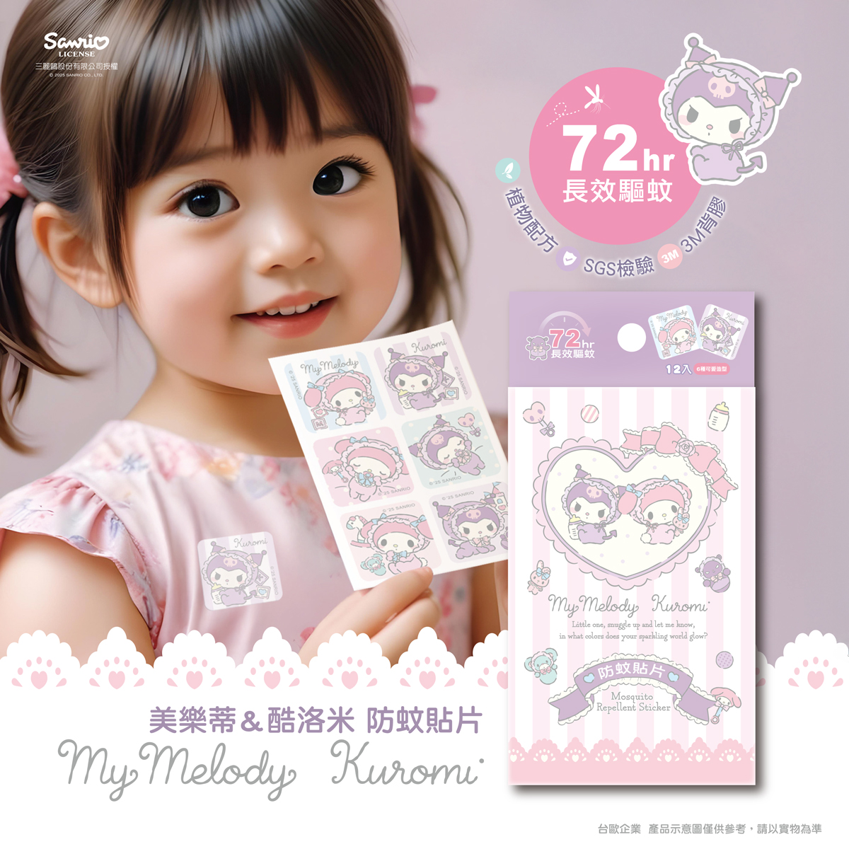 📣 台灣生活用品品牌 聯名系列 Sanrio 正版授權 — 台灣製防蚊貼 採用高品質3M背膠,好黏貼易取下不易留殘膠 貼心環保設計包裝,可回收貼片於夾鏈鋁袋內保存 產品採植物性萃取物、環保油墨印刷與無毒高密度無紡布材質製成 經SGS國際檢驗與國立大學時效檢測,不含重金屬及環境用藥DEET 材質:無毒高密度無紡布、3M背膠 主要成分:香茅、尤加利、(PMD檸檬胺)植物性配方