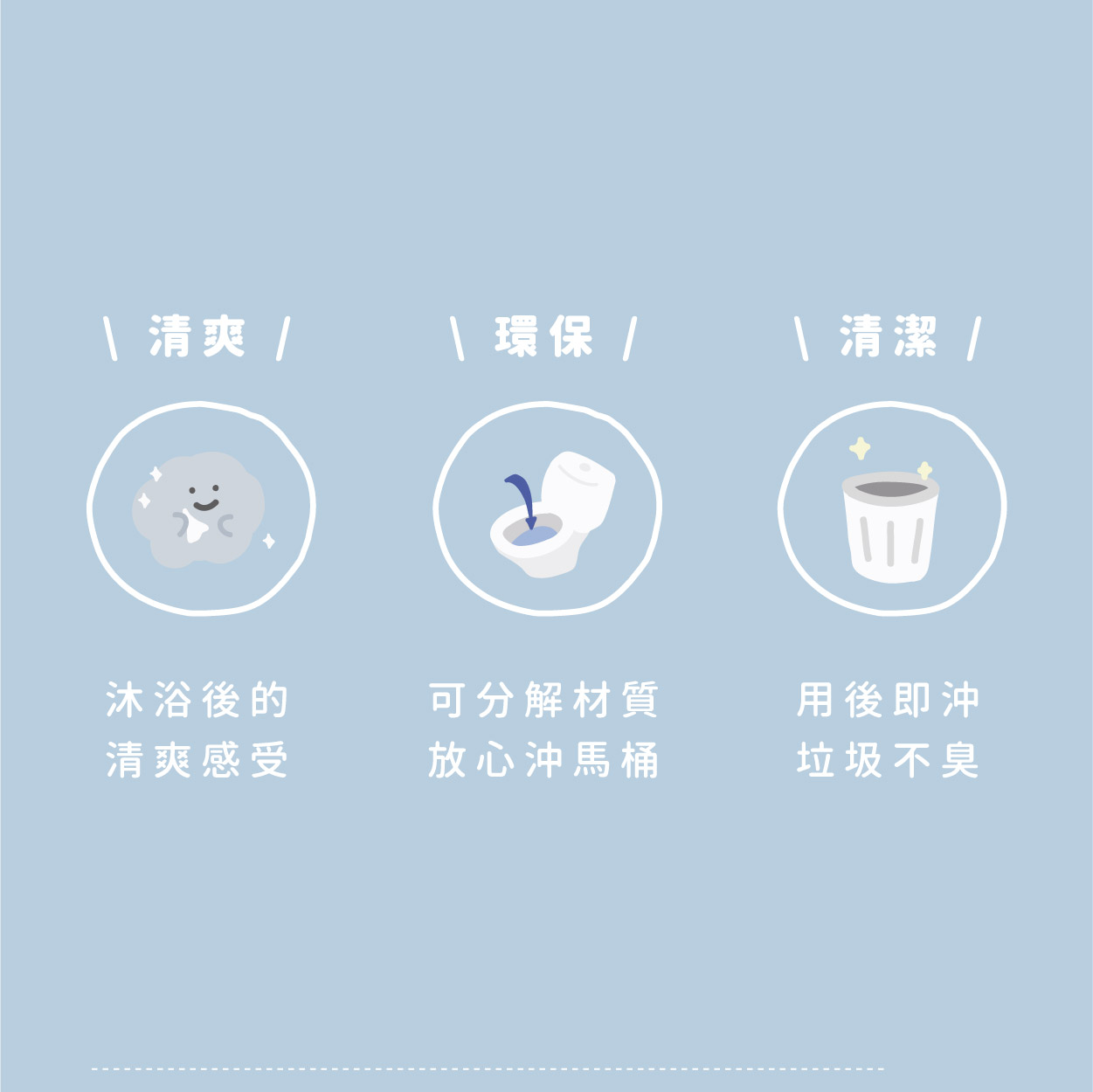 台灣人氣 IP 方坊療癒聯名款 不添加薄荷腦,蠶豆症可用! 觸感厚實、不透手,女性專用,維持pH值平衡 金盞花萃取,降低乾澀感;洋甘菊萃取,舒緩敏感 不含酒精、不含螢光劑、不含paraben;使用RO純水製作 銷售重點: 日常、經期、久坐悶熱,外出不方便沖水清洗私處時的好幫手,連孕婦也可以使用的安心選擇,使用後可直接沖馬桶,減少廁所臭味和細菌滋生、降低垃圾量,永續環保愛地球。