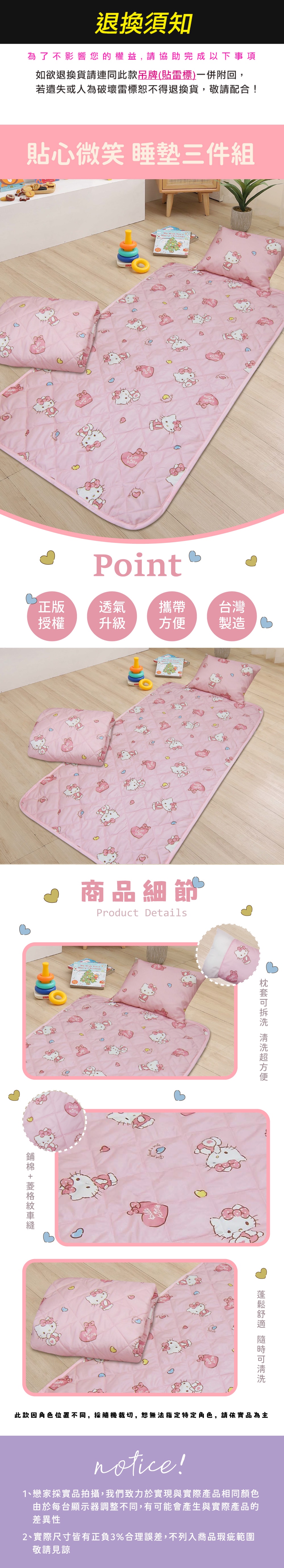 📣 台灣 Sanrio 正版授權系列 人氣 KITTY 兒童三合一睡墊套裝 透氣舒適,收納方便附收納袋 全程百分之百台灣製台灣物料 物料: 台灣精製磨毛科技纖維 內容和尺寸: 涼墊*1(150x78cm) 涼被*1(150x110cm) 可拆式童枕*1(36x46cm) 清洗方式: 以冷水清洗晾乾即可。 請勿烘乾,避免高溫縮水。 請使用中性洗劑,勿使用衣物柔軟精。